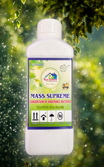 Mass Supreme Bio Cleaner is a powerful biological formula designed to improve septic tank performance naturally. It breaks down waste, prevents blockages, and eliminates foul odor without using harmful chemicals.